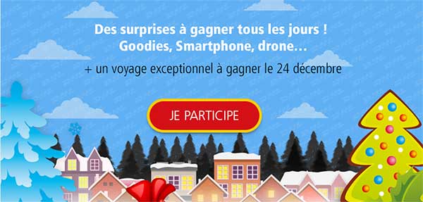 - Modalités de participation : Avoir un compte Facebook puis compléter le bulletin de participation et cliquer sur la case du jour du Calendrier de l’Avent. Vous jouerez à un mini-jeu aléatoire (Bandit manchot, Click and Win, Game Trivia…). Le résultat sera immédiat.