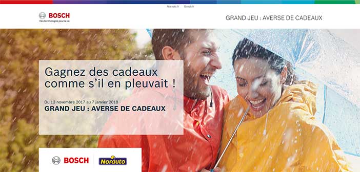 En partenariat avec le garage en ligne Norauto, procurez-vous une paire de balais d’essuie-glaces Bosch et participez au Grand Jeu Averse de Cadeaux Bosch présent via l’URL www.aversedecadeaux-bosch.com et tentez de gagner un des lots exceptionnels mis en jeu parmi des visseuses IXO, des réfrigérateurs-congélateurs, des caves à vin…