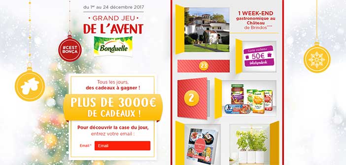 Pour participer au Jeu Calendrier de l’Avent Bonduelle, vous devez vous rendre sur la page concours : www.jeu.bonduelle.fr/grandjeudelavent pour entrer votre adresse email. Ensuite, vous serez amené à compléter le formulaire d’inscription avant d’accéder au Calendrier de l’Avent. Cliquez sur la case du jour en question puis grattez l’étiquette du cadeau pour voir si votre participation coïncide avec un des instants gagnants mis en jeu.