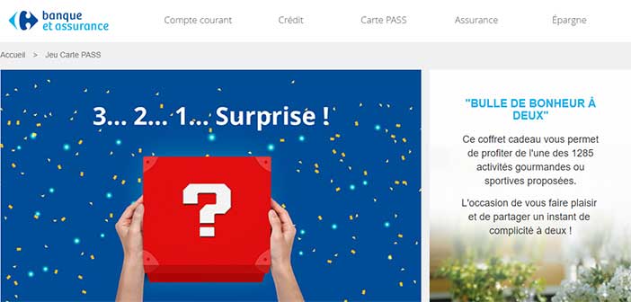 Et si vous remportiez une surprise grâce à votre carte pass? Jusqu’au 03 décembre prochain, utilisez votre Carte PASS pour être inscrit automatiquement au Jeu Carte PASS Carrefour Banque dont les modalités sont présentes sur www.carrefour-banque.fr/jeu-carte-pass, vous pourriez gagner par la même occasion un des 500 coffrets Smartbox « Bulle de bonheur à deux »!