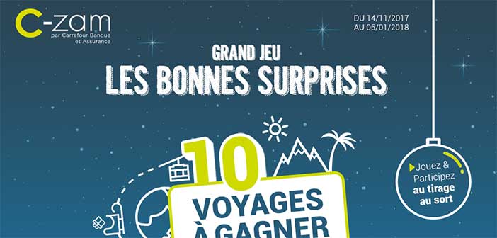 Le compte courant C-Zam de Carrefour Banque vous invite à jouer durant le temps des fêtes de Noël au Grand Jeu C-Zam Les Bonnes Surprises disponible via l’URL www.compteczam.fr/jeu. En vous inscrivant au jeu, vous pourriez gagner un des 10 séjours avec Carrefour Voyages de 3.000 euros chacun !